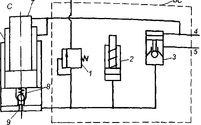 В состав БС входит: 1 - предохранительный клапан, 2 - индикатор давления, 3 - обратный разгрузочный клапан или гидрозамок. Гидролинии 4 и 5 предназначены для соединения стоечного гидроблока с соответствующим гидрораспределителем.