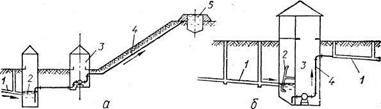 а - на очистные сооружения; б - из заглубленного коллектора врасположенный выше; 1- самотечный коллектор; 2 - приемный резервуар с решеткой; 3 - машинное отделение;