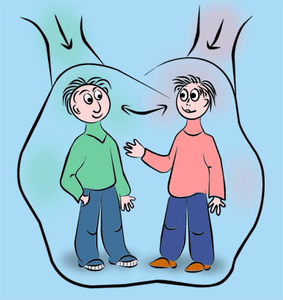 Во время любого общения между двумя людьми возникает определенная медитация, то есть их точки сборки перемещаются в положения, из которых как-то виден партнер, а пару окружает некоторое тонкое облако, в которое входят каналы ведущих эгрегоров партнеров. Через это облако идет двусторонний обмен информацией между эгрегорами. Чем лучше партнеры понимают друг друга, тем интенсивнее может идти обмен между эгрегорами, если, конечно, им есть что сказать друг другу (см. рис 7.1).