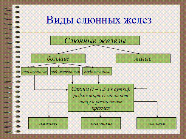 Выработка слюны происходит в слюнных железах, их три пары: околоушные, нижнечелюстные и подъязычные. Слюна смачивает полость рта, облегчая артикуляцию, смачивает пережёванную пищу, усиливает вкусовые ощущения. Слюна очищает полость рта и обладает бактерицидными свойствами благодаря присутствию в ней лизоцима. При уменьшении слюноотделения возникает чувство жажды, стимулирующее потребление жидкости. Наконец, под действием слюны начинается расщепление углеводов.