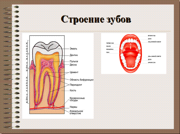 У взрослого человека 32 зуба, расположенные в ячейках челюстей. По форме и функциям различают резцы (8), клыки (4), малые коренные (8), большие коренные (12). В каждом зубе различают коронку, шейку и корень. Коронку зуба покрывает эмаль (самая твёрдая ткань в организме). Под эмалью расположен дентин (образует большую часть зуба). Шейка и корень зуба покрыты цементом. Полость зуба заполняет соединительная ткань – пульпа. В пульпу через канал корня входят кровеносные и лимфатические сосуды, нервы. За счёт пульпы зуб растет.