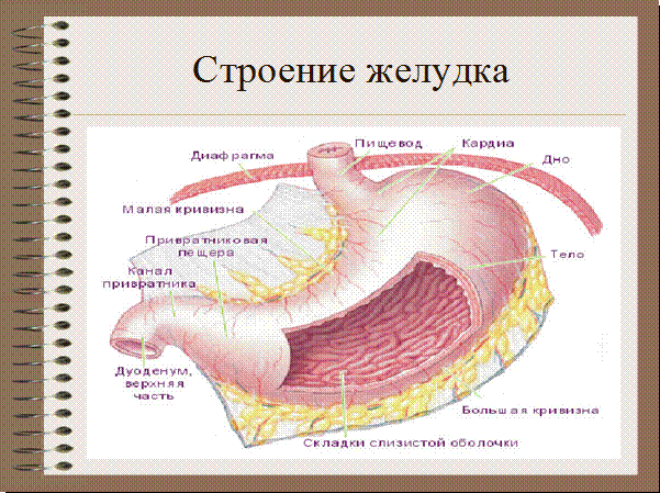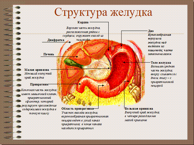 Он расположен под диафрагмой с левого бока и имеет вид мешка, в котором различают следующие отделы кардиа, дно, тело, большую и малую кривизну и пилорическую часть представленную привратниковой пещерой, каналом привратника и самой областью этого сфинктера.