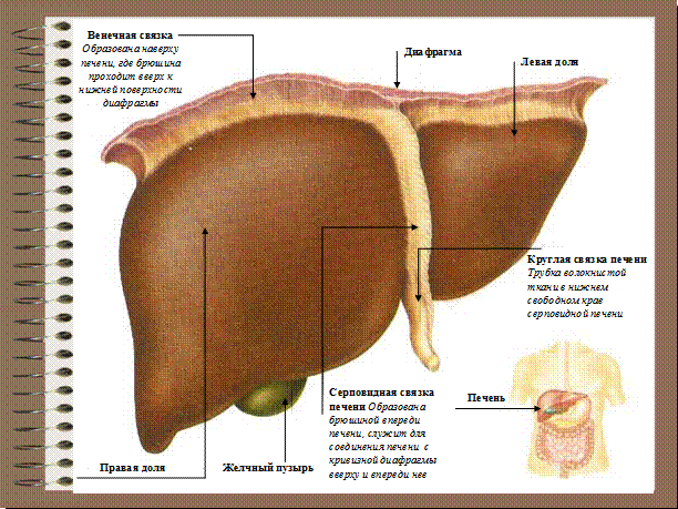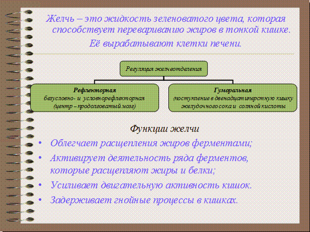 Печень – это самая крупная железа организма, расположена в правом подреберье под диафрагмой. В печени постоянно образуется желчь – зеленовато-жёлтая, горькая на вкус жидкость. Когда пищеварение не происходит, желчь скапливается в жёлчном пузыре. За сутки вырабатывается около 600 мл желчи.
