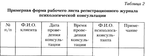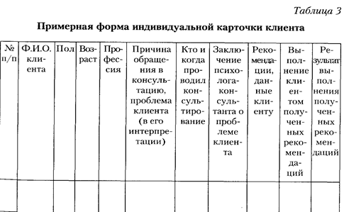 3. Оборудование места проведения консультирования необходимой документацией и обеспечение средствами ее хранения, в частности регистрационным журналом, картотекой клиентов и сейфом (сейф нужен и для хранения файлов с конфиденциальной информацией при использовании компьютера). В регистрационный журнал, образец формы которого приводится ниже в таблице 2, записываются общие данные о клиентах и о проведении консультаций. В картотеку (табл. 3) вносятся персональные данные о каждом клиенте, полученные в ходе консультации в результате расспроса клиента психологом-консультантом. Эти данные должны быть достаточно подробными для того, чтобы по ним можно было составить представление о клиенте и о сути его проблемы. Сейф или компьютер нужны для того, чтобы в них можно было хранить картотеку клиентов и другие, не подлежащие разглашению, данные.