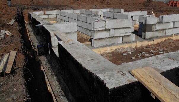 При песчаных грунтах фундаментные блоки укладывают непосредственно на выровненное основание, при других грунтах - на песчаную подушку толщиной 10см. Под подошвой фундаментов нельзя оставлять насыпной или разрыхленный грунт, его необходимо удалить и вместо него засыпать песок или щебень. Углубления в грунтовом основании высотой более 10 см заполняют монолитным бетоном. Ширину и длину песчаного основания делают на 20...30 см больше размеров фундамента, чтобы блоки не свисали с песчаной подушки.