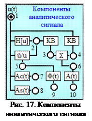 При выборе данной работы генератор сигналов (рис. 14), выводимый на лабораторный стол, дополняется блоком «Компоненты аналитического сигнала» (рис. 17). Этот блок содержит: преобразователь Гильберта «H[u]», квадраторы «КВ», делитель «ũ/u» сигнала ũ = H [ u (t)] на сигнал u (t), сумматор сигналов «Σ», вычислители косинусного «Ac(t)» и синусного «As(t)» компонентов, фазы «Ф(t)» и огибающей «A(t)» входного сигнала u (t). Десятикнопочный переключатель служит для подключения измерительных каналов к отдельным узлам блока. На вход 1 всегда поступает сигнал u (t) от генератора, описанного в работе 1.