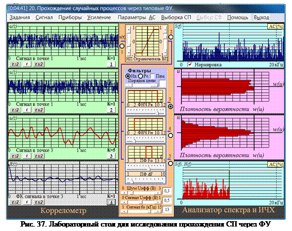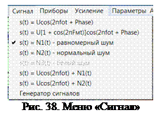 Типичная конфигурация лабораторного стола для работ данного раздела представлена на рис. 37. Исходный сигнал или случайный процесс (СП) можно выбрать, раскрыв пункт меню «Сигнал s(t)» (рис. 38), где перечислены возможные их варианты. Выбранный сигнал проходит через ограничитель мгновенных значений «Ограничитель» и набор фильтров (ФНЧ, ФВЧ и ПФ). Нижний и верхний пороги ограничения в ограничителе устанавливаются движковыми регуляторами «НП» и «ВП» и отображаются на индикаторе функциональной характеристики ограничителя. Устанавливая предельные пороги, можно из двустороннего ограничителя получить односторонний ограничитель или повторитель. Предусмотрена возможность перестройки фильтров и выбора их порядка с помощью соответствующих движковых регуляторов. Результаты настройки фильтров отображаются на индикаторах их АЧХ.