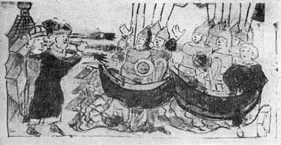 Морской поход Игоря на Константинополь в 941 г. Миниатюра из Радзивиловской летописи. XV в.