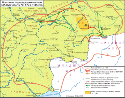Когда до Петербурга дошли известия о разгроме экспедиции В. А. Кара и самовольном отъезде самого Кара в Москву, Екатерина II указом от 27 ноября назначила новым командующим А. И. Бибикова[21]. В состав нового карательного корпуса вошли 10 кавалерийских и пехотных полков, а также 4 лёгких полевых команды, спешно направленных с западных и северо-западных границ империи к Казани и Самаре, а кроме них — все гарнизоны и воинские части, находящиеся в зоне восстания, и остатки корпуса Кара. Бибиков прибыл в Казань 25 декабря 1773, и сразу же началось движение полков и бригад под командованием П. М. Голицына и П. Д. Мансурова к осаждённым пугачёвскими войсками Самаре, Оренбургу, Уфе, Мензелинску, Кунгуру. Уже 29 декабря возглавляемая майором К. И. Муфелем 24-я лёгкая полевая команда, подкреплённая двумя эскадронами бахмутских гусар и другими частями, отбила Самару. Арапов с несколькими десятками оставшихся с ним пугачёвцев отступил к Алексеевску, но возглавляемая Мансуровым бригада разгромила его отряды в боях под Алексеевском и у Бузулукской крепости, после чего в Сорочинской соединилась 10 марта с корпусом генерала Голицына, который подошёл туда, продвигаясь от Казани, разгромив восставших под Мензелинском и Кунгуром.