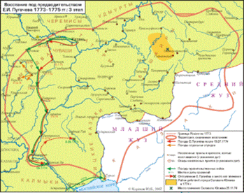 В это время, помимо разрозненных очагов восстания, организованный характер имели боевые действия в Башкирии. Салават Юлаев вместе со своим отцом Юлаем Азналиным возглавлял повстанческое движение на Сибирской дороге, Каранай Муратов, Качкын Самаров, Селяусин Кинзин — на Ногайской, Базаргул Юнаев, Юламан Кушаев и Мухамет Сафаров — в Башкирском Зауралье. Они сковывали значительный контингент правительственных войск. В начале августа был предпринят даже новый штурм Уфы, но в результате слабой организации взаимодействия между различными отрядами он сложился неудачно. Тревожили набегами на всём протяжении пограничной линии казахские отряды. Губернатор Рейнсдорп докладывал: «Башкирцы и киргизцы не усмиряются, последние поминутно переходят через Яик, и из-под Оренбурга хватают людей. Войски здешние или преследуют Пугачёва, или заграждают ему путь, и на киргизцев идти мне не льзя, хана и салтанов я увещеваю. Они отвечали, что они не могут удержать киргизцев, коих вся орда бунтует» [36]. С поимкой Пугачёва, направлением в Башкирию освободившихся правительственных войск начался переход башкирских старшин на сторону правительства, многие из них присоединились к карательным отрядам. После захвата в плен Канзафара Усаева и Салавата Юлаева восстание в Башкирии пошло на убыль. Свой последний бой Салават Юлаев дал 20 ноября под осаждённым им Катав-Ивановским заводом и после поражения пленён 25 ноября. Но отдельные повстанческие отряды в Башкирии продолжали сопротивление до лета 1775.