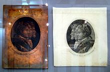 Екатерина II с сыном и старшим внуком. Гравюра и медная доска в зеркальном отражении для её печати