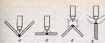 Качество шва в большой степени определяется надежностью оттеснения от зоны сварки воздуха. Необходимый расход защитного газа устанавливают в зависимости от состава и толщины свариваемого металла, типа сварного соединения и скорости сварки. Соединения на рис. 8, а и б для достаточной защиты требуют нормального расхода газов. Типы соединений на рис. 8, в и г требуют повышенного расхода защитного газа, поэтому при сварке этих соединений рекомендуется применять экраны, устанавливаемые сбоку и параллельно шву. Поток защитного газа при сварке должен надежно охватывать всю область сварочной ванны, разогретую часть присадочного прутка и электрод. При повышенных скоростях сварки поток защитного газа может оттесняться воздухом.
