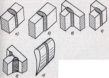 а) и б) – стыковые, в) и д) – тавровые, г) – угловое, е) – переменного сечения