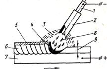1-металлический стержень; 2-покрытие электрода; 3-газовая атмосфера дуги; 4-сварочная ванна; 5- затвердевший шлак; 6-акристаллизовавшийся металл шва; 7-основной металл (изделие); 8-капли расплавленного электродного металла; 9-глубина проплавления
