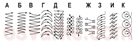 Рисунок 25 – Основные виды траекторий движений конца электрода при слабом прогреве (А, Б, В, Г), усиленном прогреве середины (Д), свариваемых кромок (Е-Ж), усиленном прогреве одной кромки (З, И), прогреве корня шва (К).
