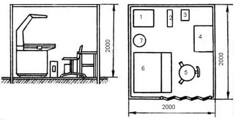 1–источник питания; 2–ящик для электродов; 3–ящик для инструмента; 4–стеллажи для деталей и готовых сварных узлов; 5–стул сварщика; 6–стол сварщика; 7– печь для прокалки электродов