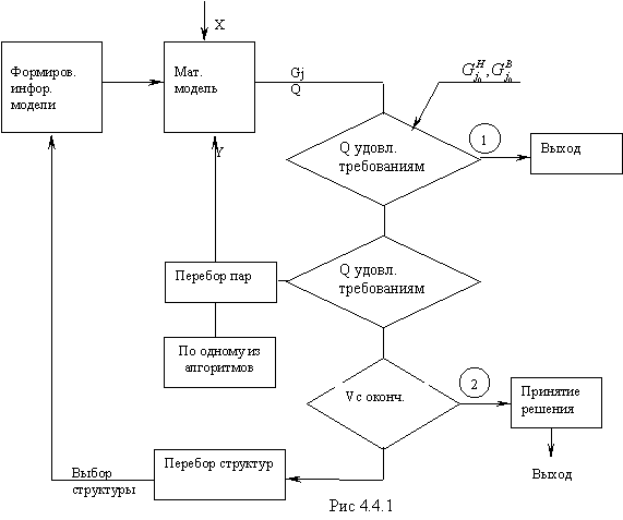 Vп, Vс – вариация пар (структур).Процедура выбора заключается в выборе некоторых данных для отобранной структуры, на основе чего и строится математическая модель. Основными показателями при реализации цикла является показатель модели, т.е. время реализации одного модельного эксперимента по расчету критериальных показателей при заданном векторе варьируемых параметров. Это модельное время.Используются различные методы для варьирования значений параметров, в том числе:а) полный перебор (сканирование), при котором задается верхние и нижние значения параметров и задается ∆yiб) метод случайного поиска.Внешний цикл – это перебор структур, часто он делается вручную.Точка 1 – выход – найдено проектное решение.Точка 2 – при неблагоприятном исходе, т.е. невозможности найти решение на обозримом числе структур в пределах заданного пространства поиска система выводит на точку 2 процедуру принятия решения. Здесь существует 2 альтернативы принятия решения:1альтернатива проектировщика: перенос ряда независимых параметров Х (внешних ограничений) в число варьируемых параметров Y;2альтернатива заказчика: уступки заказчика- снижение требований на ряд некоторых качественных характеристикЕсли альтернатива 1 – это уступка нам со стороны смежных проектировщиков, то 2 – это уступка заказчика.