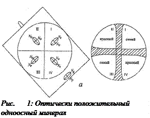 7. Для одноосных минералов коноскопическая фигура имеет вид темного креста, при вращении не сдвигается. При косом разрезе крест будет сдвинут. При вращении микроскопа ветви креста перемещаются, но остаются параллельными. Знак минерала определяется после введения компенсатора. Оптический знак считается положительным, если в I и III квадрантах появляется синяя окраска. В отрицательных минералах синяя окраска появляется в II и IV квадрантах.