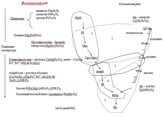 Ряд Боуэна. Последовательную смену парагенезисов, отвечающих породам нормального ряда, можно представить как реакционный ряд Боуэна. Он показал, что кристаллизация расплава начинается с образования наиболее тугоплавких, богатых Mg, Fe силикатов. Позже, по мере снижения Т, в результате реакций с расплавом, к ним присоединяются Ca-Mg силикаты и алюмосиликаты Ca, Na, K. В итоге образуется прерывистый ряд существенно железо-магнезиальных силикатов, называемых фемическими(от Fe-Mg) или мафическими (от Mg-Fe), и непрерывный параллельный ряд салических (от Si-Al) Ca-Na алюмосиликатов. Соответственно выделяют две ветви реакционного ряда Боуэна.