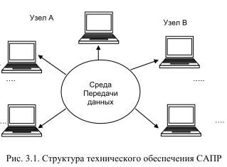 Техническое обеспечение (ТО) – средства вычислительной техники, организационной техники, техники измерений и передачи данных, а также их сочетания. Эти компоненты объединяются в вычислительные комплексы и вычислительные системы, которые составляют техническую базу САПР. Типичным примером вычислительного комплекса являются ЭВМ в соединении с внешними (периферийными) устройствами ввода, вывода и хранения информации, а также АРМ. На основе такой формулировки структуру ТО САПР можно рассматривать как сеть узлов, связанных между собой средой передачи данных.