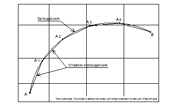 На вышеприведённом рисунке: А – пункт отхода, В – пункт прихода, А1, А2, А3, А4 – промежуточные точки ортодромии.