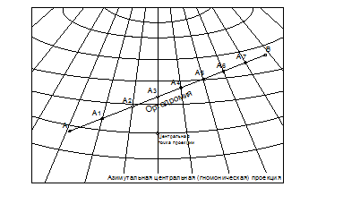Азимутальная центральная (гномоническая) проекция обладает свойством ортодромичности, так как ортодромия на ней изображается прямой линией.