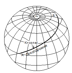 Отрезок локсодромии, заключённый между двумя точками, например А и В, не является кратчайшим расстоянием между ними на поверхности Земли.