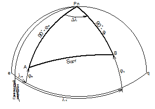 90º-φн и 90º-φк – стороны сферического треугольника, отрезки меридианов пунктов отхода А и прихода В (PnA и PnB);