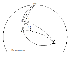 Изоазимута – изолиния пеленга на ориентир, - линия, в каждой точке которой угол П между истинным меридианом и ортодромией, проходящей через ориентир, постоянная величина.