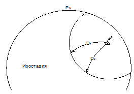Изостадия – изолиния расстояния от судна до ориентира – сферическая окружность, проведённая из точки, в которой расположен ориентир, радиусом, равным измеренному расстоянию D.