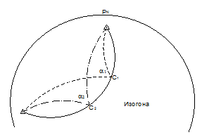 Изогона – изолиния горизонтального угла или разности пеленгов – кривая, проходящая через ориентиры, и вмещающая измеренный угол α.