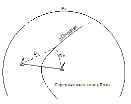 Сферическая гипербола – изолиния разности расстояний от судна до двух ориентиров – линия, в каждой точке которой разность расстояний ΔD – постоянная величина.