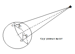 Круг равных высот – изолиния угловой высоты светила (высотная изолиния) – сферическая окружность, проведённая из географического места светила (полюса освещения), как из центра, радиусом, равным зенитному расстоянию светила.