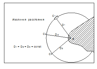 Изолиния расстояния – окружность с центром в точке, обозначающей ориентир и радиусом, равным измеренному расстоянию.