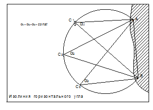 Изолиния горизонтального угла – окружность, вмещающая, измеренный горизонтальный угол, и проходящая через ориентиры и обсервованное место судна.