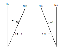 Если N часть магнитного меридиана отклонена от N части истинного меридиана к Е, то склонению присваивается наименование Е и знак «+». Если N часть магнитного меридиана отклонена от N части истинного меридиана к W, то склонению присваивается наименование W и знак «-».