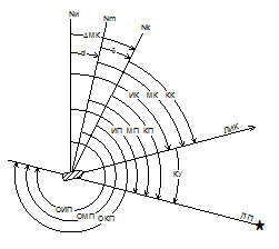 Картушка магнитного компаса под воздействием магнитного поля Земли устанавливается по магнитному меридиану Nm. Направления, отсчитываемые от магнитного меридиана называются магнитными направлениями.