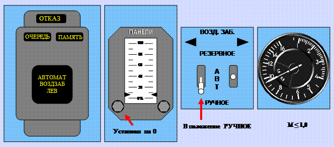 − на УСТ высвечивается сигнал АВТОМАТ ВОЗДЗАБ ЛЕВ и АВТОМАТ ВОЗДЗАБ ПРАВ (в очереди).