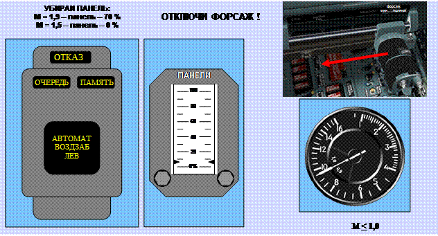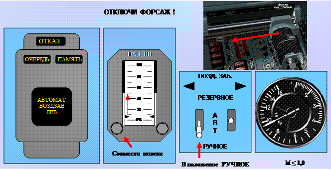 − установить переключатель ВОЗДЗАБ ◄ (►) РЕЗЕРВНОЕ-АВТ-РУЧНОЕ в положение РУЧНОЕ на 1-2 сек и снова в положение АВТ. Если сигнал АВТОМАТ ВОЗДЗАБ ЛЕВ (ПРАВ) снимается, разрешается продолжать полет без ограничений. Если сигнал продолжает высвечиваться, установить переключатель снова в положение РУЧНОЕ, отключить форсаж и по мере торможения на числе М = 1,9 установить отказавшую панель в положение 60-70 % и на числе М = 1,5 убрать полностью. Торможение продолжать до М < 1. Дросселировать двигатель разрешается на М ≤ 1,2.