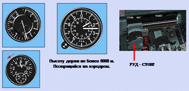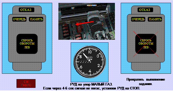 − если в течение 4-6 сек сигнал СБРОСЬ ОБОРОТЫ не погас, немедленно установить РУД на упор СТОП и, не запуская двигатель, следовать на аэродром посадки;