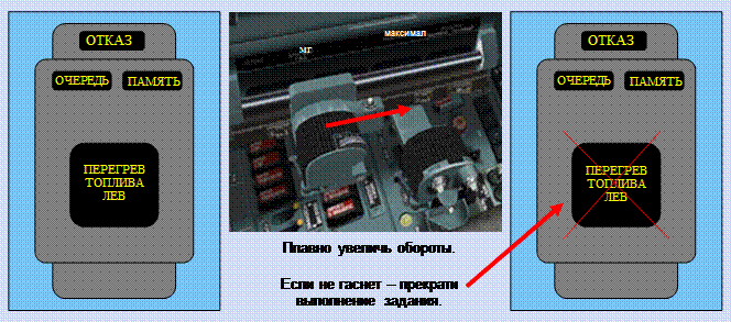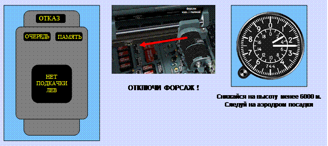 − в случае непогасания сигнала НЕТ ПОДКАЧКИ снизиться на высоту менее 6000 м на бесфорсажном режиме работы двигателей и возвратится на аэродром посадки. При этом запрещается создавать околонулевые или отрицательные перегрузки.