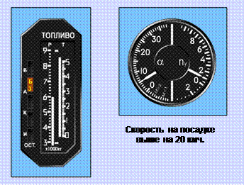 − в поете не превышать α = 10°, а при заходе на посадку выдерживать скорость на 20 км/ч больше обычной. Для определения посадочного веса пользоваться показаниями расходомера.