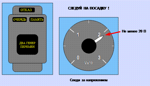 − на УСТ высвечивается сигнал ДВА ГЕНЕР ПЕРЕМ (ОТКЛЮЧИ ПРИВОД ЛЕВ ГЕНЕР; ОТКЛЮЧИ ПРИВОД ПРАВ ГЕНЕР, при этом возможно высвечивание в очереди сигнала отказа генератора или двух генераторов переменного тока);