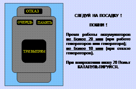 Признак: на УСТ высвечивается сигнал ТРИ ВЫПРЯМ. При этом отключается питание тех же потребителей, что и при отказе двух ВУ. Остальные потребители получают питание от аккумуляторных батарей, которые обеспечивают работу в течение 20 минут при работе одного или двух привод-генераторов, а при отказе их – в течение 10 минут.