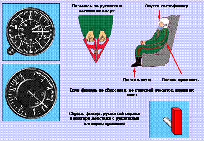 − взяться обеими руками за рукоятки катапультирования и повторно вытянуть их вверх до катапультирования.