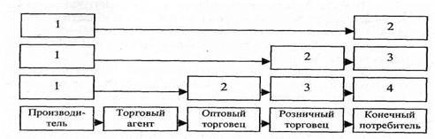 Длина канала товародвижения определяется числом независимых посредников. Встречаются одноуровневые (один посредник), двухуровневые (два посредника - оптовый и розничный), трехуровневые (три посредника - крупный оптовик, мелкий оптовик, розничный торговец) каналы (рис. 2).