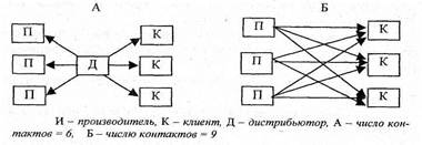 В части А показано, что при наличии одного посредника устанавливается контакт с тремя клиентами, а в части Б - как три производителя пытаются достичь трех клиентов.