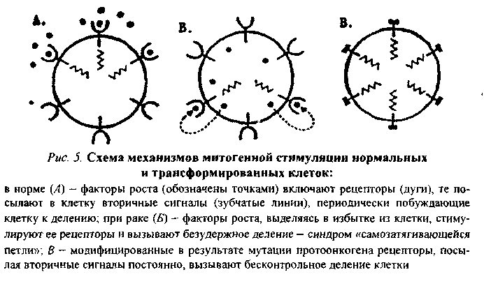 Продукты онкогенов могут действовать на ключевые внутриклеточные процессы, участвующие в контроле роста клеток без внешней их стимуляции. Так, продукт гена sre, являющийся тирозинпротеинкиназой, может воздействовать на митотическую активность клетки и тем самым влиять на фосфори лирование ключевых регуляторных белков. Аналогичный эффект возможен при действии продукта гена ras, стимулирующего (опосредованно) активность аденилатциклазы.