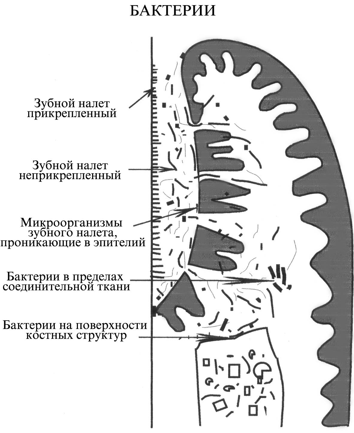 | Рис. 6. Зубной налет, связанный с поверхностью зуба и тканями периодонта (Carranza F.A. 1990 г.) |
