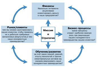 Из сказанного выше следует, что при определении и описании ключевых факторов стоимости необходимо учитывать не только традиционные параметры, такие как затраты, доходы, капитальные вложения и т.д., но и параметры, влияющие на интеллектуальный капитал, обеспечивающий большую долю стоимости компании. Наиболее удобным инструментом, позволяющим оценивать развитие и достижение поставленных целей во всех аспектах деятельности предприятия, является сбалансированная система показателей (в дальнейшем BSC). BSC - это система стратегического управления и оценки её эффективности, которая переводит миссию и общую стратегию компании в систему четко поставленных целей и задач, а также показателей, определяющих степень достижения данных установок. Система сбалансированных показателей (BSC) получила свое название, так как она включает в себя показатели, характеризующие четыре аспекта деятельности компании (перспективы в терминах BSC) - финансы, рынок (маркетинг), внутренние процессы и обучение и рост. Как мы видим, данные 4 перспективы охватывают, в том числе, и рассмотренную выше категорию интеллектуального капитала.